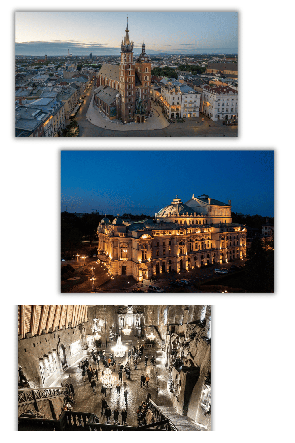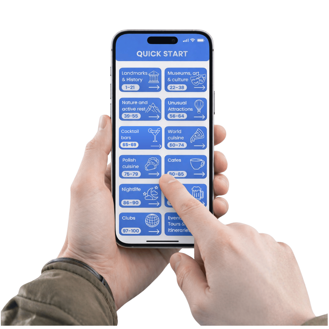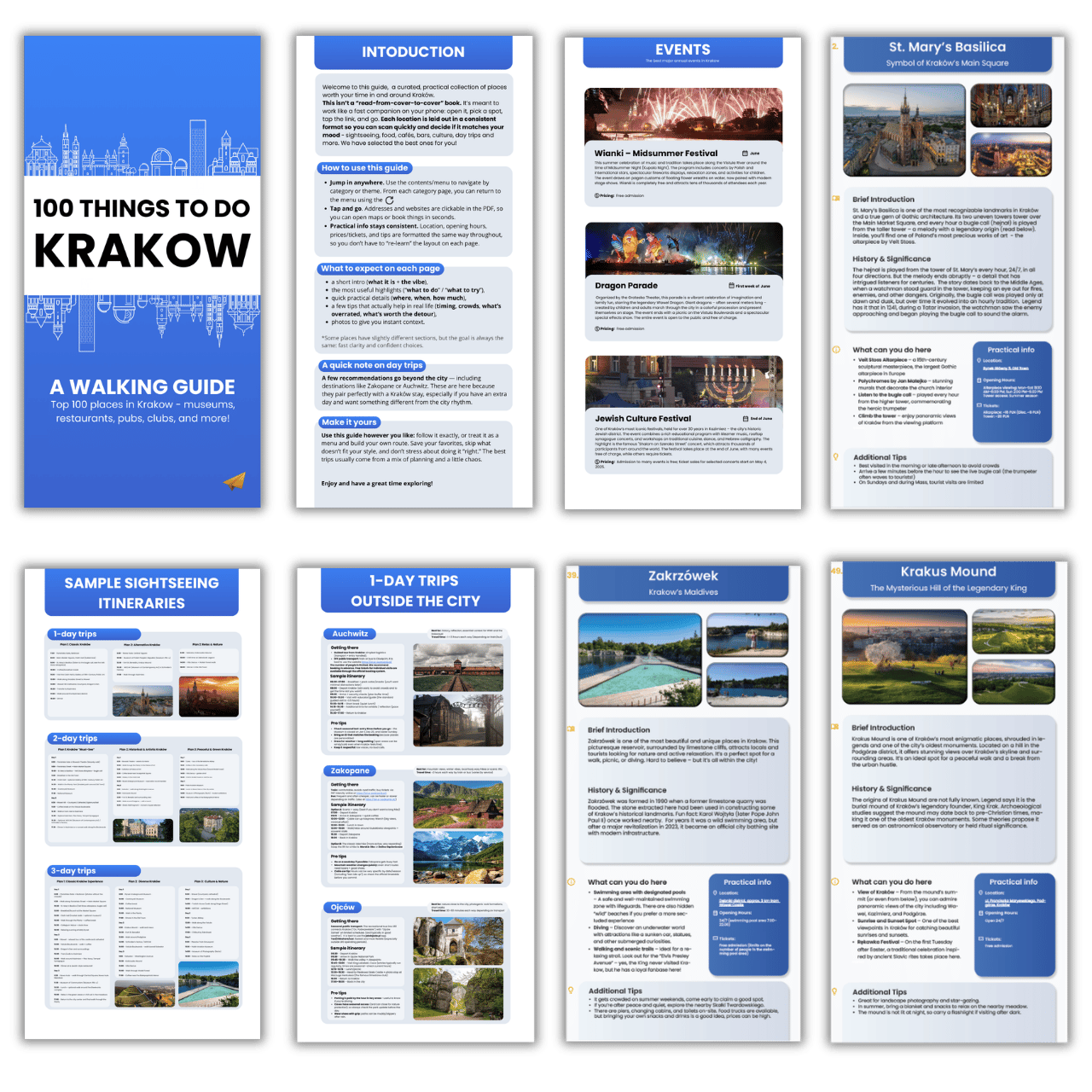 Interactive Krakow guide with 100+ curated places, ready-made itineraries, food & nightlife picks — all clickable and fully offline on your phone.